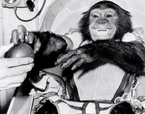 Астронавт-шимпанзе получает яблоко, после первого успешного полета в космос, США, 1961 год.