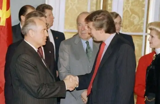 Михаил Горбачев обменивается рукопожатием с Дональдом Трампом перед завтраком в Госдепе США. 1987 год.