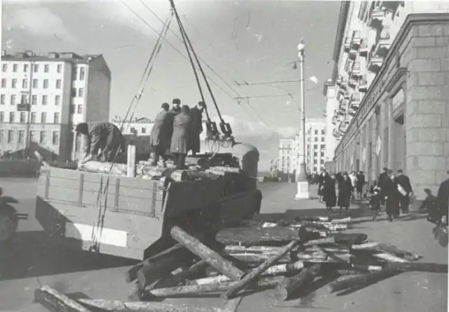 Разгрузка дров из грузового троллейбуса на улице Горького, 1941 год, Москва