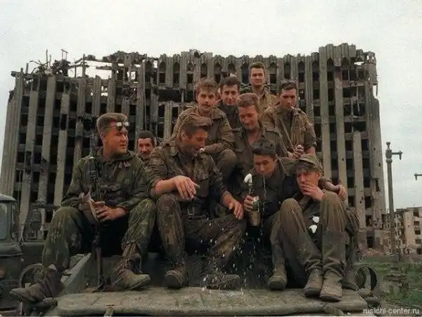 Российские войска празднуют захват президентского дворца в Грозном, Первая чеченская война, 1995 год.