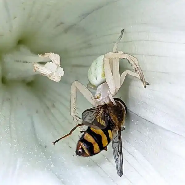 Замаскированный под цветок паук, атакует муху, замаскированную под осу