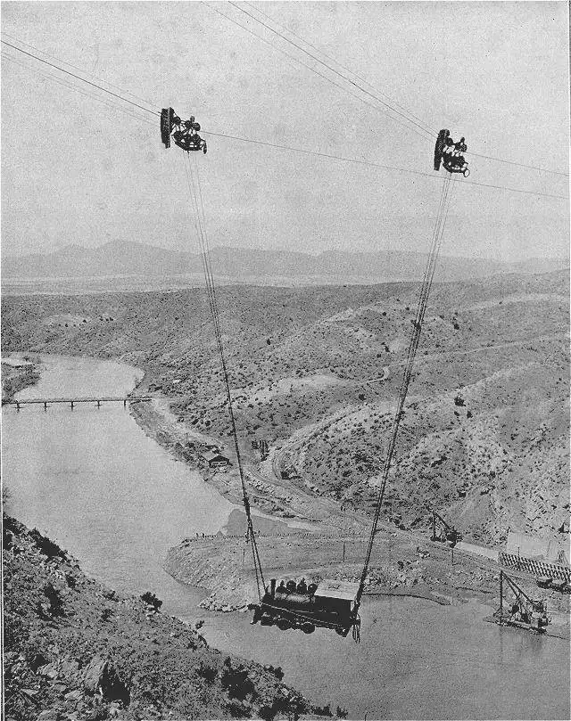 Канатная переправа паровоза через каньон реки Рио-Гранде, штат Нью-Мексико, фото 1915 года