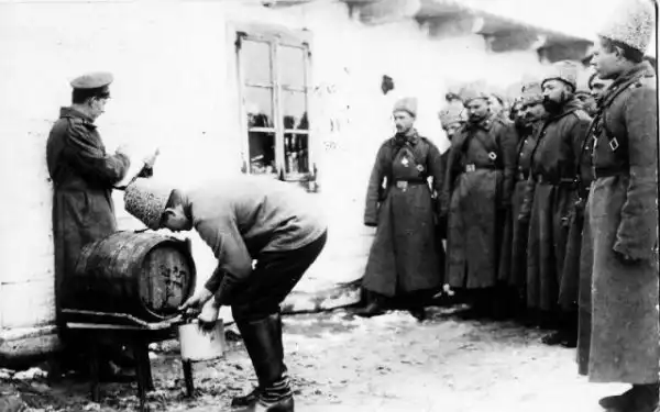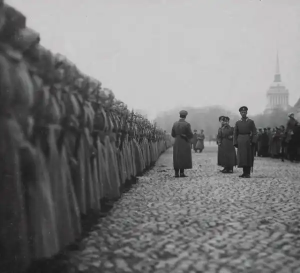 Солдаты Женского батальона готовятся к параду на Дворцовой площади, Петроград, 1917 год.