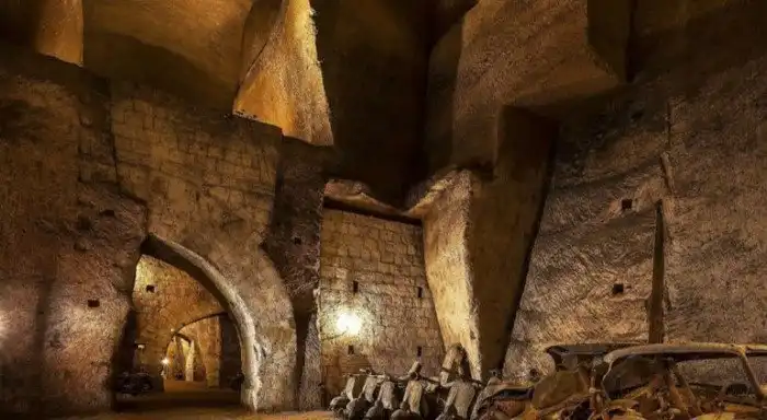 Это место заполнено ретро автомобилями, мотоциклами и скутерами, выпущенными в промежуток между 40-ми и 50-ми годами, но стены и туннели, среди которых покоится техника выглядят еще более древними.