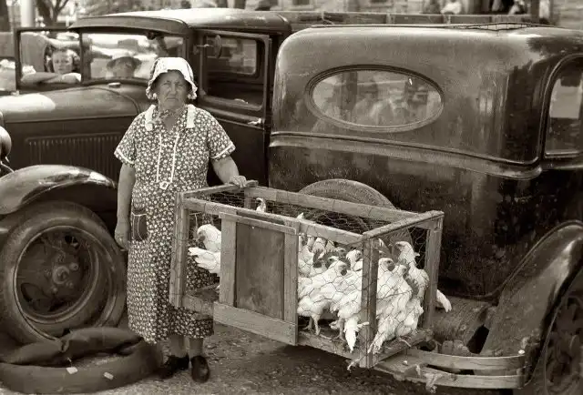 Цыплята на продажу, фермерский рынок в Уэтерфорде, штат Техас. Май 1939 года.