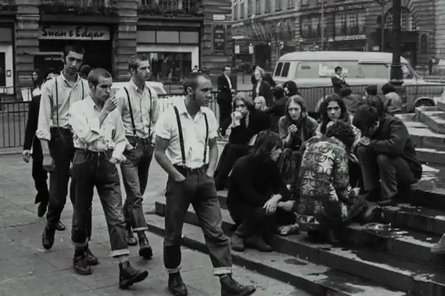 Площадь Пикадилли, Лондон, 1969 год, группа скинхедов проходит мимо группы хиппи