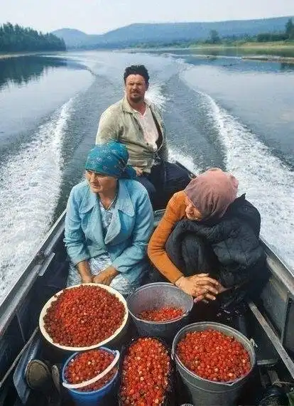 Река Бирюсе. Жители деревни возвращаются после сбора ягод. СССР, 1990-е годы.