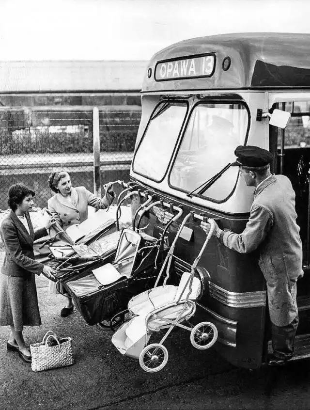 Необычное место для колясок в передней части автобуса. Новая Зеландия, 1950 год.