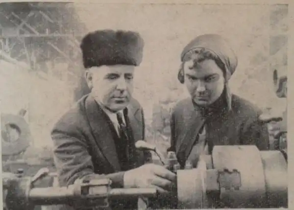 Индеец–чероки Джо Баргер обучает советскую комсомолку работе на американском станке, 1931 год, Сталинградский тракторный завод
