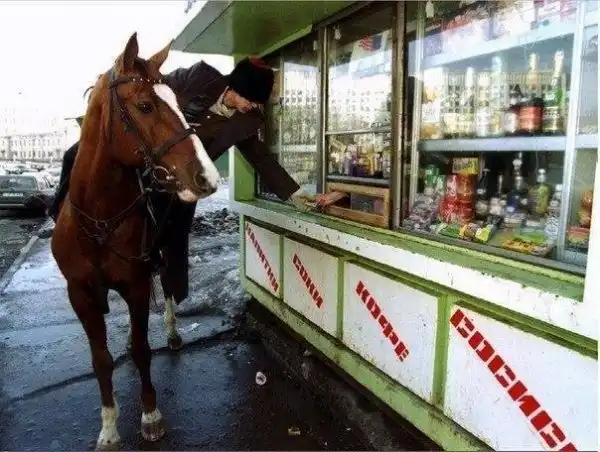 Казак на лошaди покупает бутылку водки в ларьке, во время парада на День Святого Патрика, Москва, 1994 год.