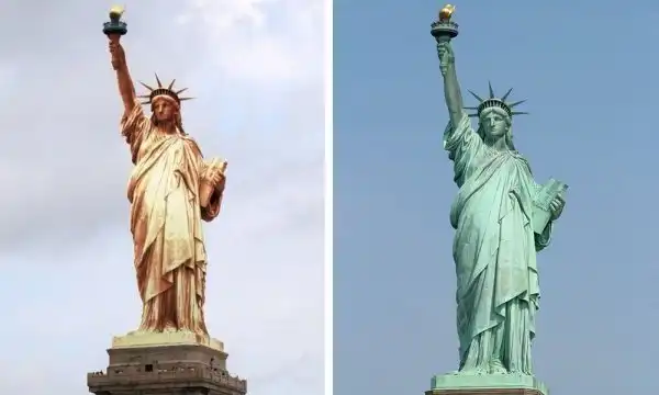 Медная Статуя Свободы разительно изменилась в цвете за первые 30 лет своего существования.Она потеряла свой коричнево-красный оттенок. из-за процесса окисления меди. Таким образом, спустя 134 года после ее открытия, уже мало, кто помнит символ Нью-Йорка не зеленым.