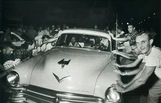Толпа пытается перевернуть автомобиль с темнокожей семьей во время расовых беспорядков в г. Клинте, США. 1956