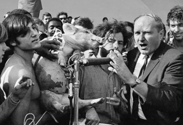 Дэвид Деллинджер и Джерри Рубин выдвигают свинью на пост президента в Грант-Парке, Чикаго. США.