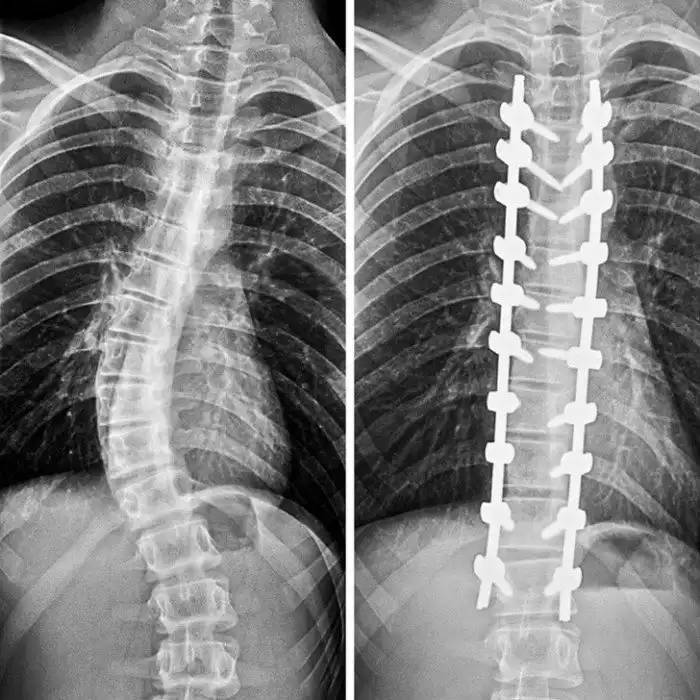 Так выглядит позвоночник после коррекционной операции при сколиозе.