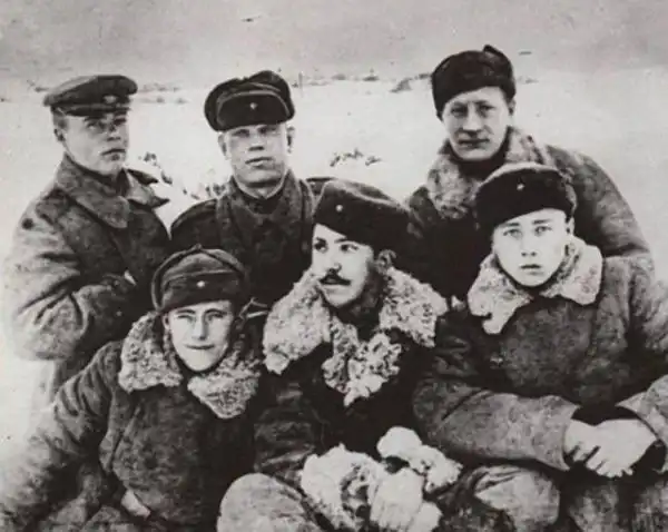 Старший сержант Юрий Никулин с однополчанами из 72-го отдельного зенитного дивизиона, 1943 год.