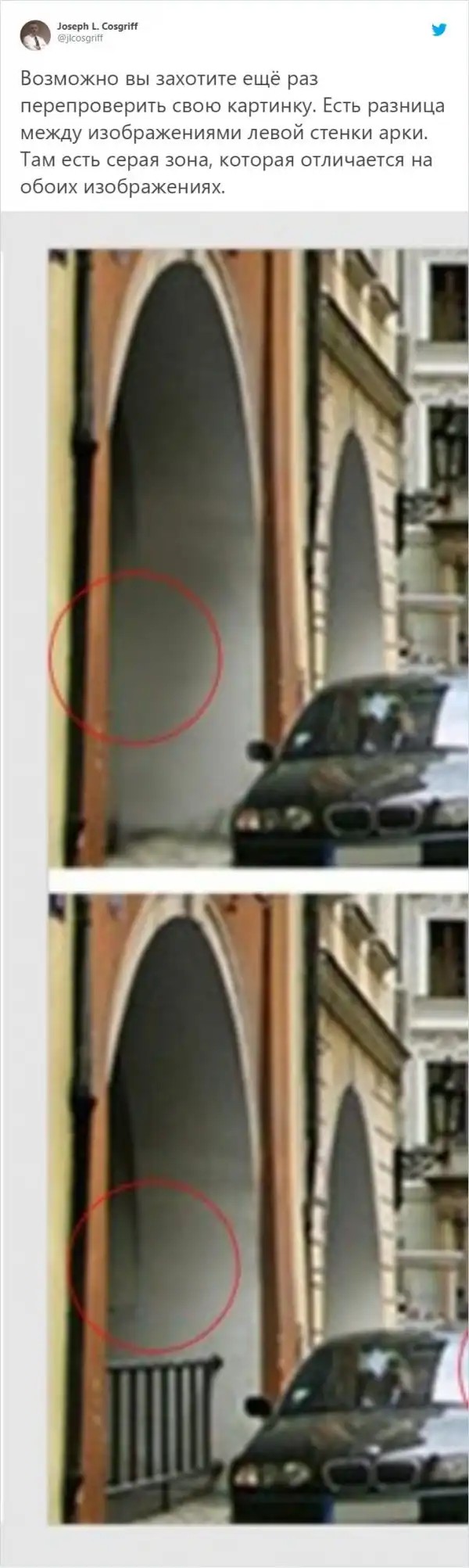 Пользователь отметил зеленым цветом ещё два места, которые отличаются друг от друга. Это значок BMW и кусочек тени под аркой.