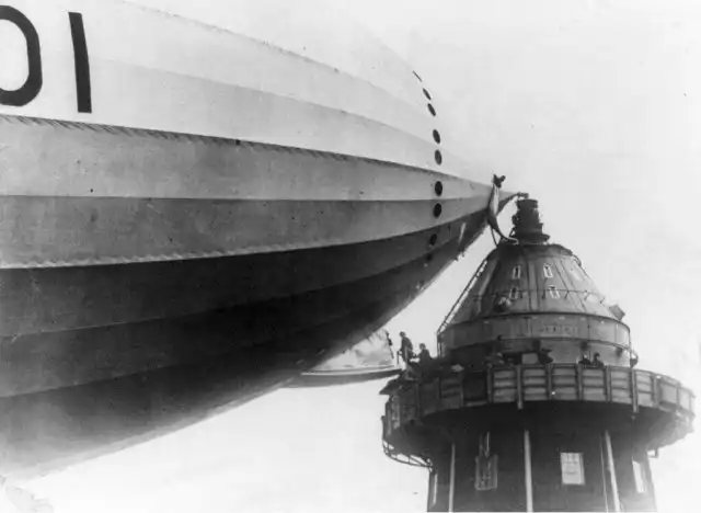 Погрузка пассажиров на дирижабль с причальной мачты в начале 1930-х годов.