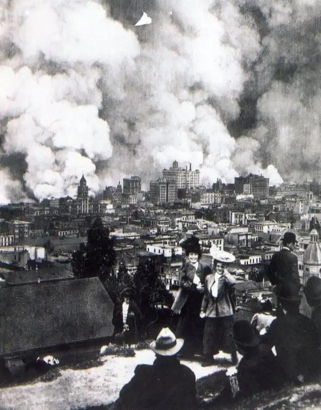 Барышни фотографируются на фоне пожара в Сан-Франциско, вызваного землетрясением, 18 апреля 1906 года.
