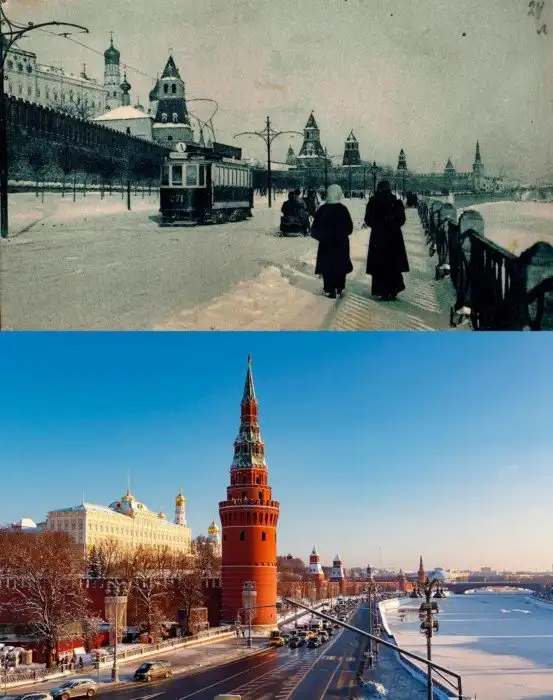 Кремль все тот же, но близлежащие здания и даже мосты были реконструированы. Что касается Храма Христа Спасителя, с которого была сделана эта фотография, то он был снесен советскими властями и восстановлен только в 1990-х годах.