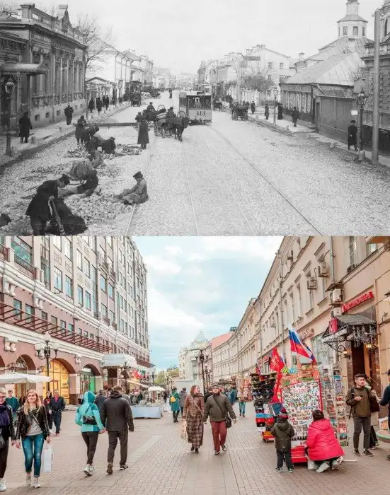 Впервые электрические трамваи появились на улице Старый Арбат в 1908 году, заменив вагоны, запряженные лошадьми, которые использовались последние 30 лет или около того. Сегодня улица полностью пешеходная. Было время, когда она гудела творческой энергией, домами для художников и богемцев, но в наши дни это практически музей под открытым небом, полный театров, квартирных музеев и памятников.