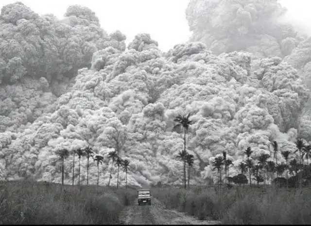 Водитель пикапа пытается сбежать от облака пепла, во время извержения вулкана Пинатубо на Филиппинах.