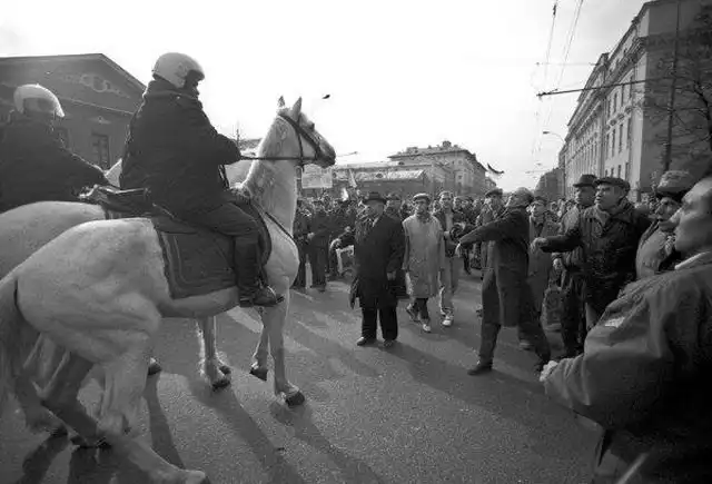 Конная милиция, преградившая путь демонстрантам, накануне всероссийского референдума о доверии Президенту Российской Федерации Б.Н. Ельцину 25 апреля 1993 года.