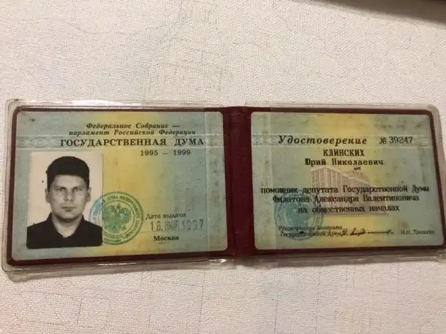 Удостоверение помощника депутата 1995-1999 от ЛДПР Юрия «Хоя» Клинских, вокалиста группы «Сектор газа»