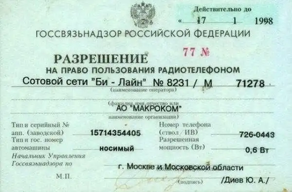 Разрешение на право использования мобильного телефона, 1997 год.