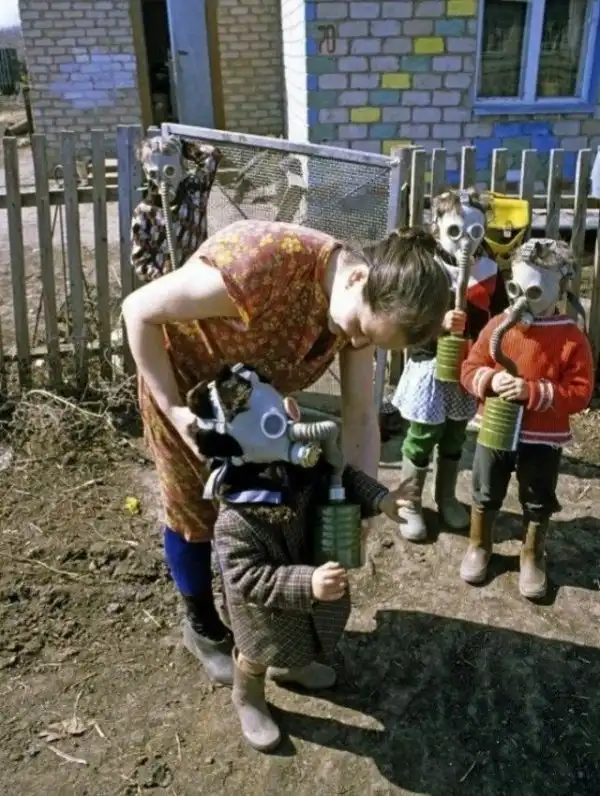 Жители села в противогазах после выброса в атмосферу вредных веществ. Село Мужичья Павловка. Оренбургская область. РСФСР. СССР. 1990 год.