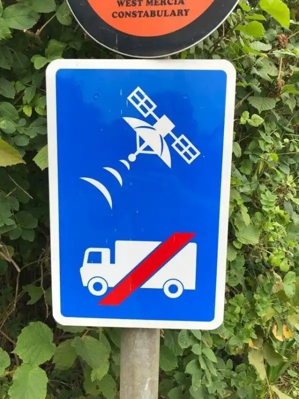 Ответ: он предупреждает о том, чтобы большие транспортные средства не следовали за спутниковой навигацией на дальнейшем участке дороги.