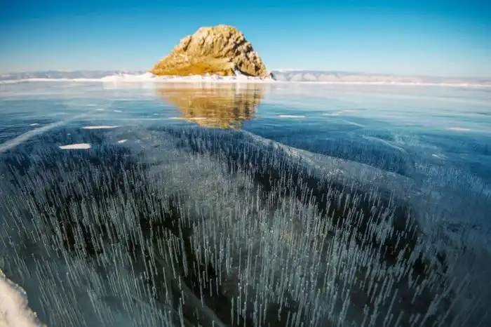На озере Байкал лед всегда прозрачный до дрожи в пальчиках ног. Видны и глубины, и застывшие пузырьки газа, и прочие чудеса.