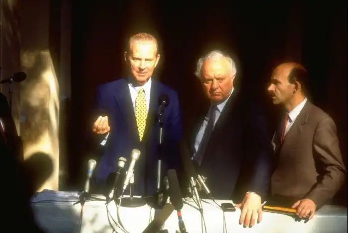 Министр иностранных дел СССР Эдуард Шеварднадзе. государственный секретарь США.Джеймс Бейкер и переводчик Павел Палаженко во время двусторонних переговоров в Иркутске