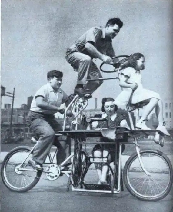 Семейный велосипед, на котором умещается вся семья, с добавленной швейной машинкой... 1939 год.