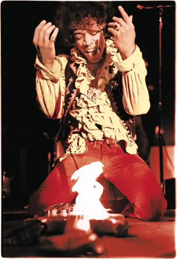 Джимми Хендрикс поджигает гитару на фестивале в Монтерее, 1967 год, США