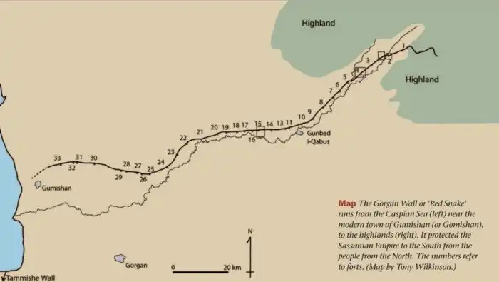 Кстати, подобная стена расположена по другую сторону Каспийского моря, как бы продолжая фортификационную систему