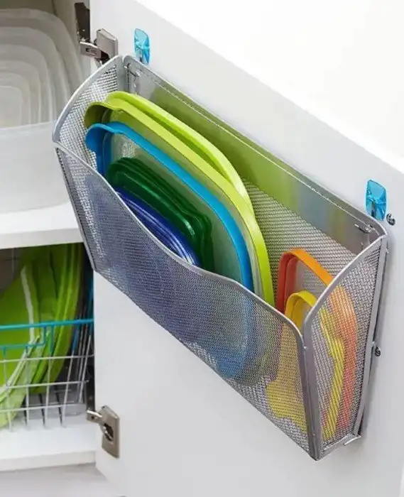"Если повесить офисный контейнер для файлов на внутреннюю стенку дверцы в шкафчик с контейнерами, то крышки у них перестанут теряться".