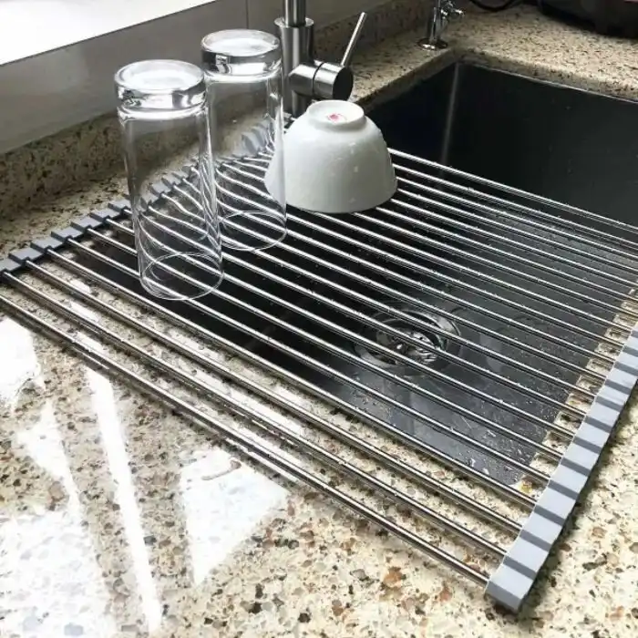 "Выдвижная сушка для посуды, которая легко убирается после того, как посуда подсохла, и ее можно убрать в шкаф".