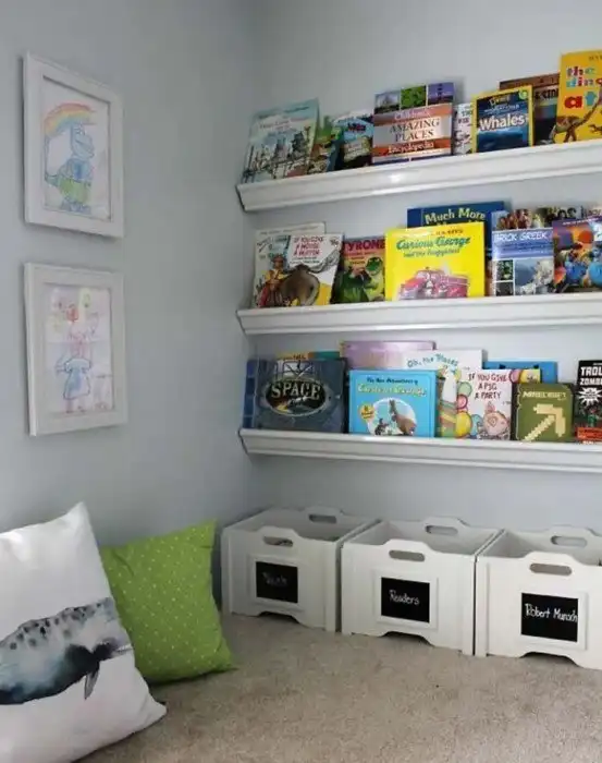 "Из ливнеотводных желобов очень удобно сделать полки для детских книг - ребенок сразу может найти и взять нужную.