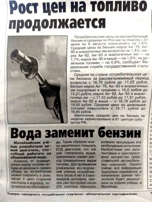 Ничего нового: рост цен на топливо продолжается. А водопроводных двигателей внутреннего сгорания пока не видать...