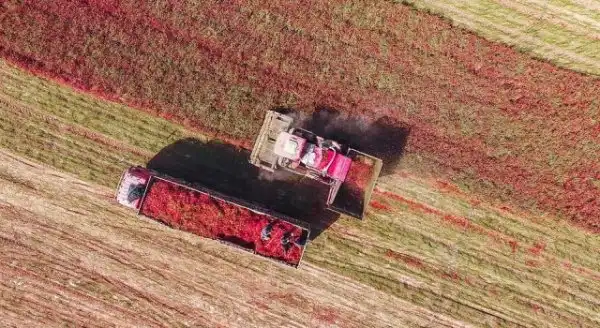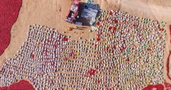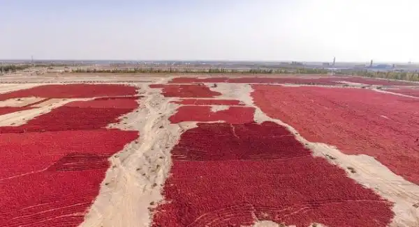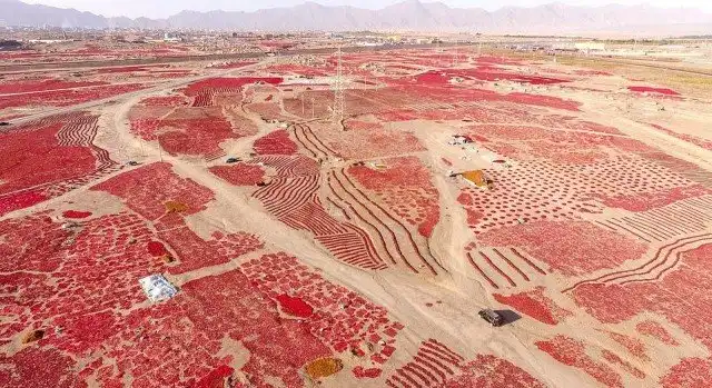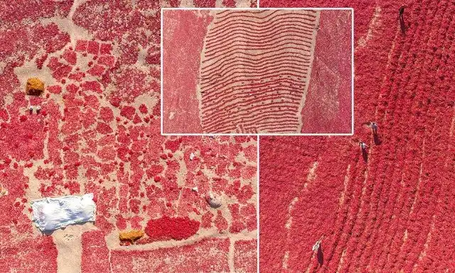 Удивительные аэрофотоснимки показывают поля перцев в Кучэ, Синьцзян-Уйгурском автономном районе на северо-западе страны. Фермеры сажают чили после сбора урожая чеснока примерно в мае. Перцы собирают с августа по октябрь, а затем отправляют на рынок, как только они высохнут.