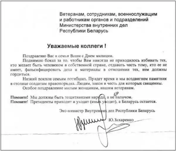 Поздравление с Днём милиции от экс-министра МВД Беларуси Юрия Захаренко, пропавшего без вести 7 мая 1999 года.