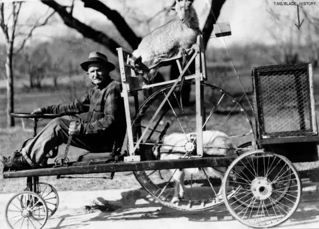 Американский фермер демонстрирует свое транспортное средство. Приводится в движение козлом, который находится в беговом колесе. Козломобиль мог достигать скорости до 15 км/ч. Козёл–запаска вверху.