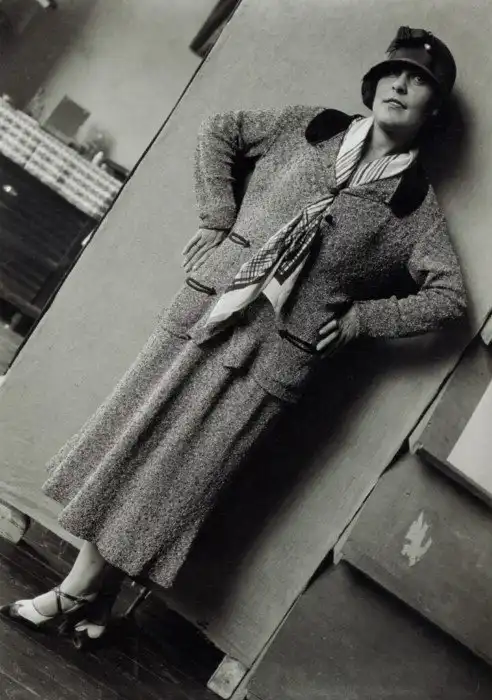 Варвара Степанова. Платье сшито из ткани,по эскизу Степановой на Первой ситценабивной фабрике.