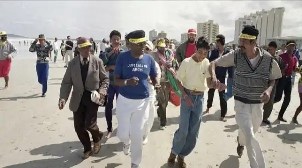 Вопреки законам апартеида, архиепископ Десмонд Туту (в голубом) и его сторонники бегают по белоснежному пляжу в Кейптауне. Южная Африка, 1989 год.