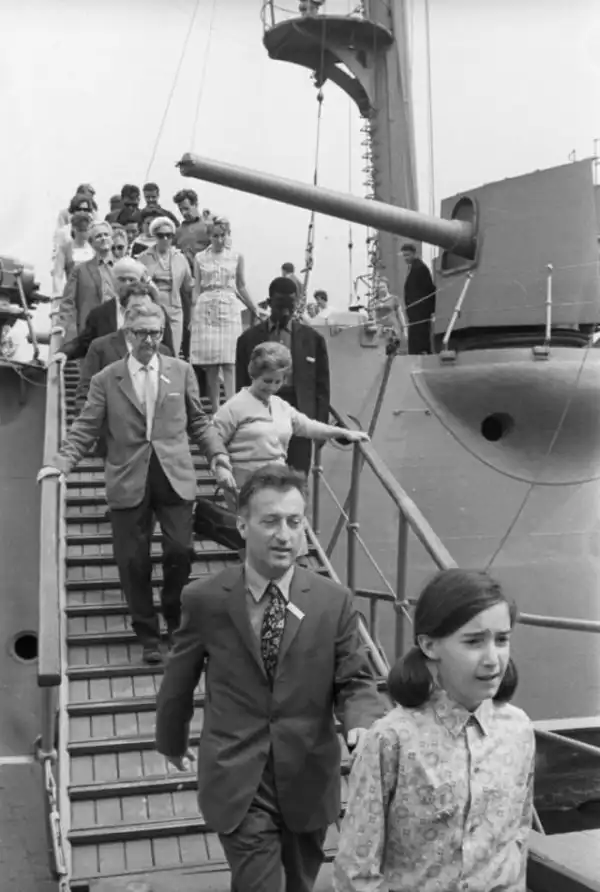 Джанни Родари с дочерью Паолой во время экскурсии на крейсер "Аврора", 1967 год, Ленинград
