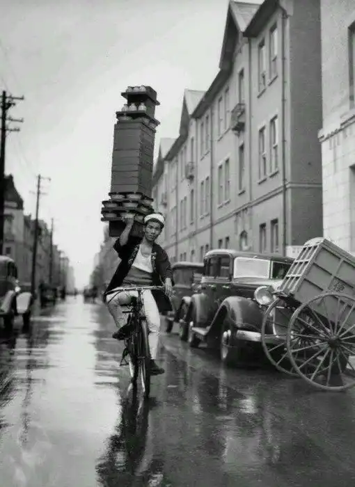 Курьер, одного из ресторанов Токио развозит заказы на велосипеде, 1972 год