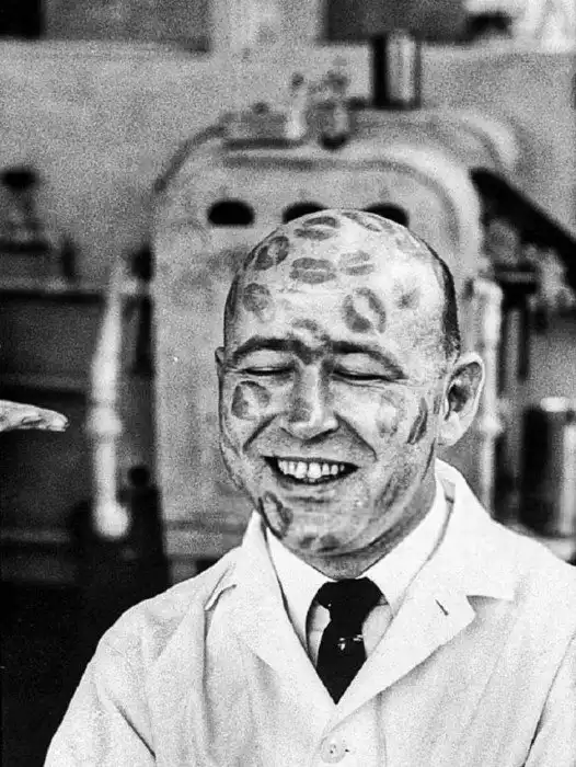 Сотрудник косметической фирмы испытывает на себе помады на предмет токсичности, 1960 год.