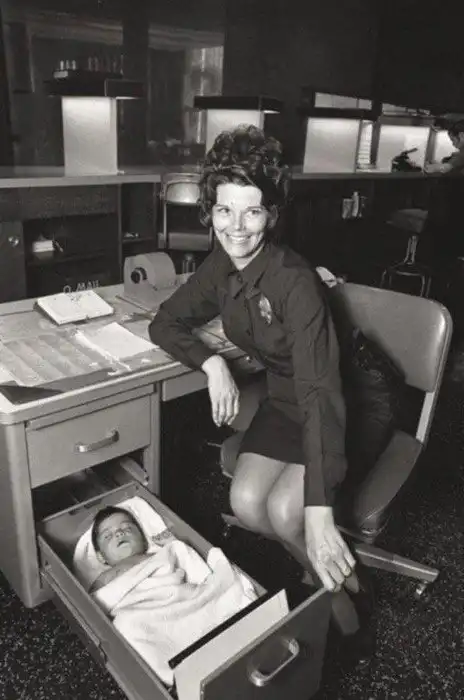 Женщина-полицейский присматривает за брошенным младенцем, бережно уложив его в ящике своего стола. Лос-Анджелес, 1971 г.