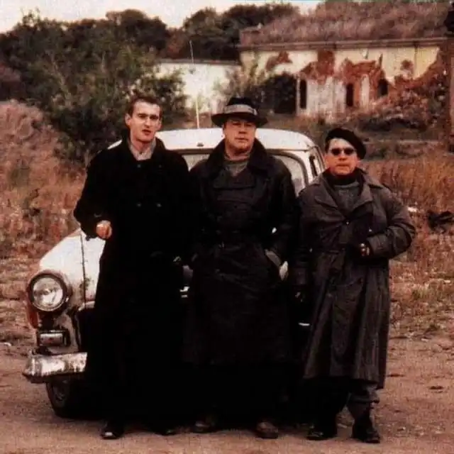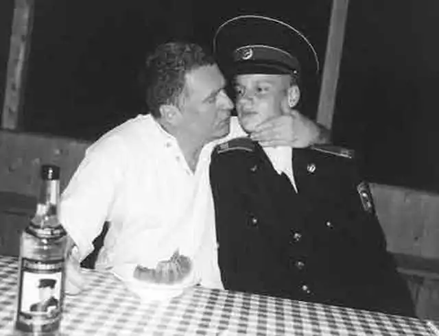 Владимир Жириновский прижимает к себе суворовца во время шторма на качающейся палубе корабля, 1990-е.