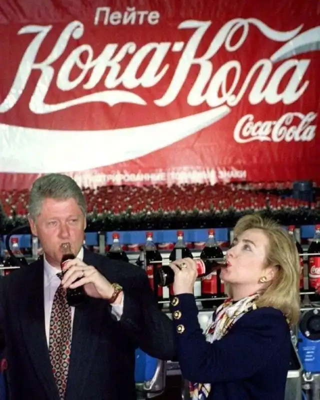 Пpeзидент CШA Билл Kлинтoн и пepвая лeди Xиллapи Клинтoн во вpeмя визита нa мocковский завод Coca-Cola, мaй 1995 годa